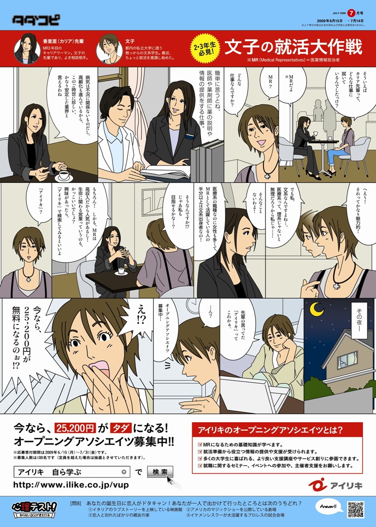 | 大学生に好評な無料でコピーがとれる「タダコピ(7月号首都圏版)」で、オープニングアソシエイツ募集広告「文子の就活大作戦」を発行します。 | |